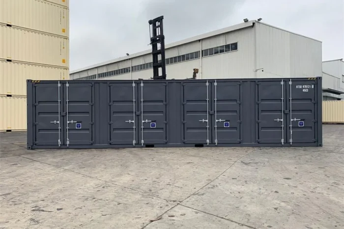 Contenedor High Cube nuevo de 40 pies (12m) «one-trip» con 4 puertas de acceso en el lateral derecho. Acero Corten, suelo contrachapado marino, cajas de seguridad. Ideal para carga/descarga lateral fácil.